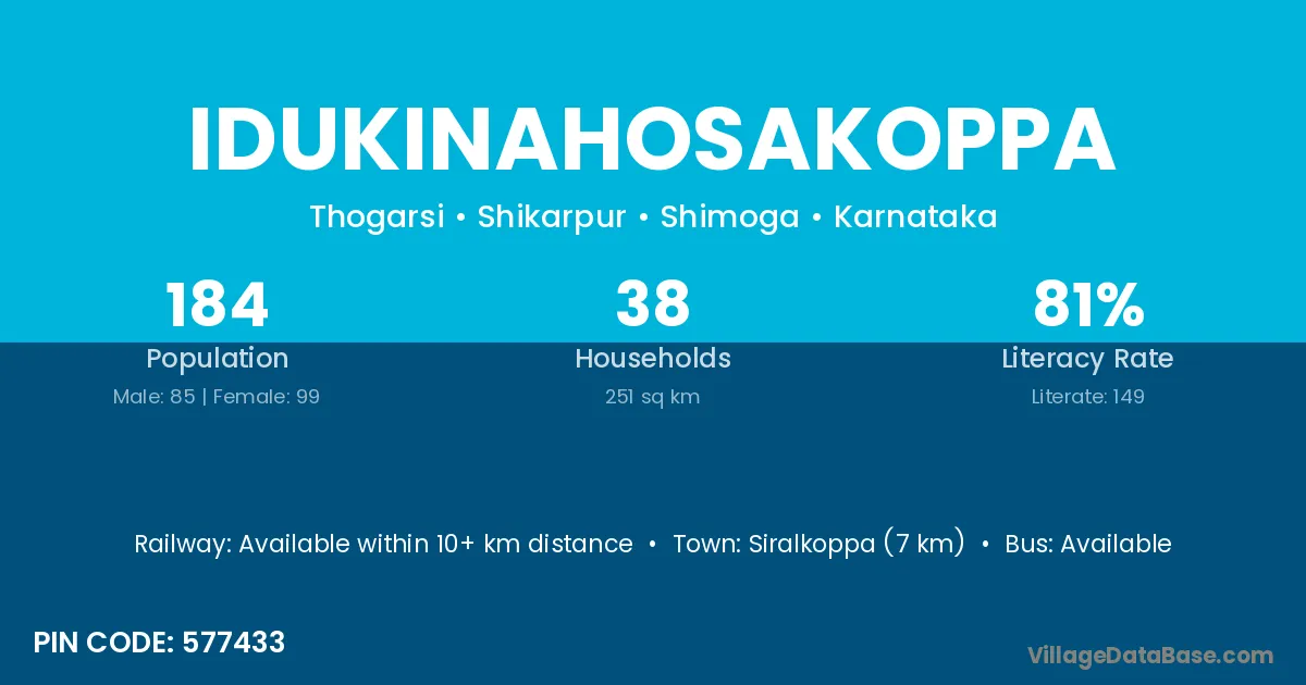 Siralkoppa (7 km) is the nearest town to Idukinahosakoppa village for major economic activities and is located approximately 7 km away.