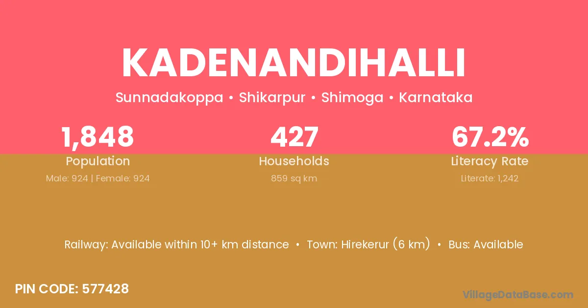 Kadenandihalli village has a total population of 1,848 people, of which 924 are males and 924 are females.