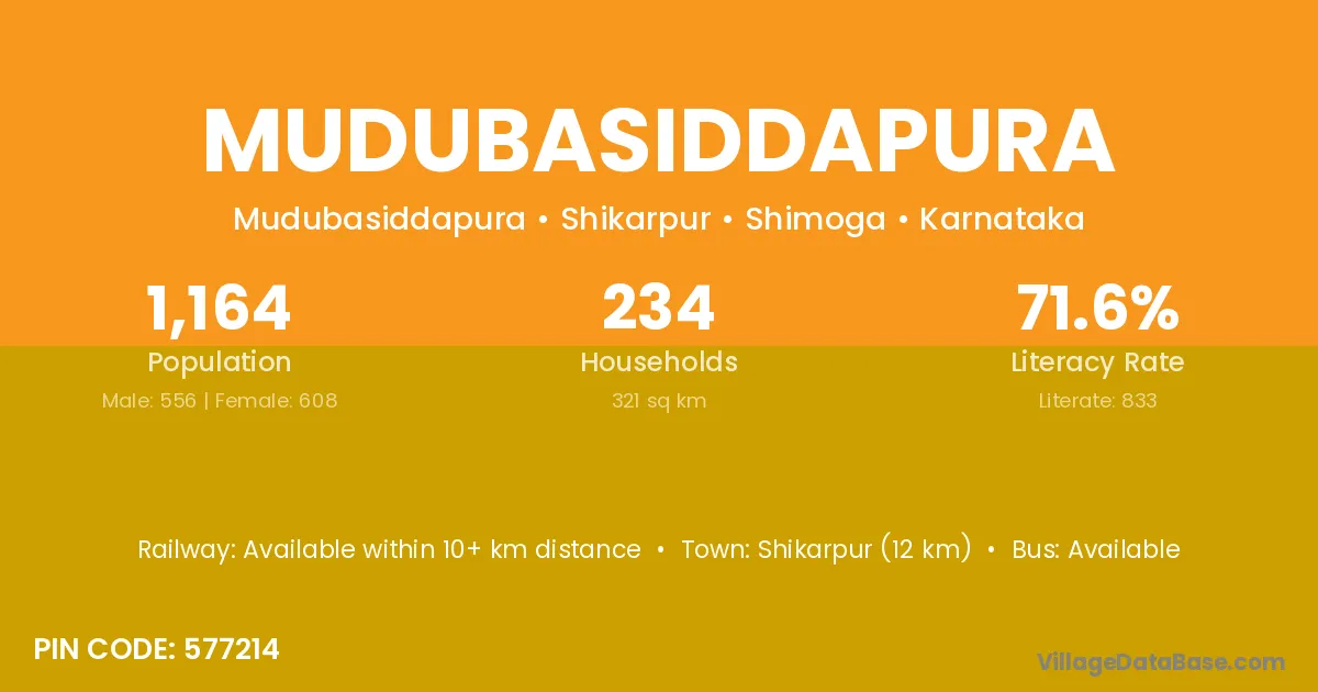 Shikarpur (12 km) is the nearest town to Mudubasiddapura village for major economic activities and is located approximately 12 km away.