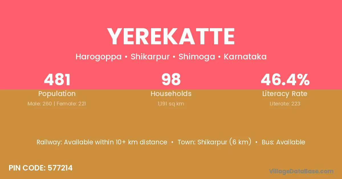 Yerekatte village has a total population of 481 people, of which 260 are males and 221 are females.
