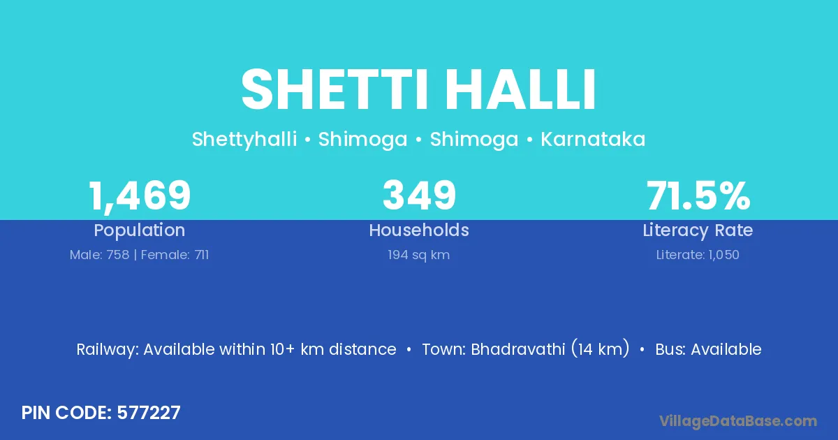 Bhadravathi (14 km) is the nearest town to Shetti Halli village for major economic activities and is located approximately 14 km away.