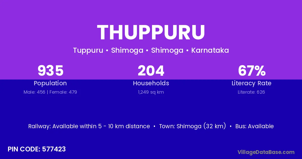 Shimoga (32 km) is the nearest town to Thuppuru village for major economic activities and is located approximately 32 km away.