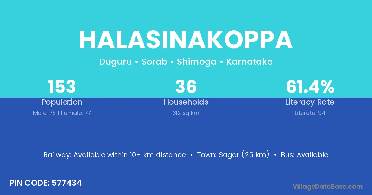 Sagar (25 km) is the nearest town to Halasinakoppa village for major economic activities and is located approximately 25 km away.