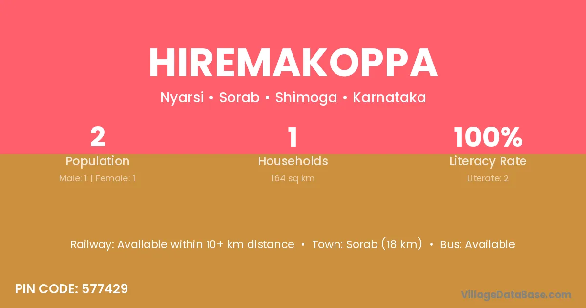 Hiremakoppa village has a total population of 2 people, of which 1 are males and 1 are females.