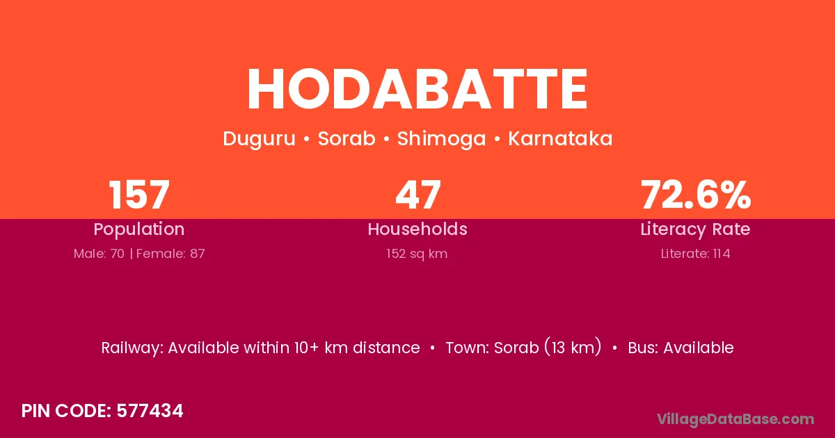Sorab (13 km) is the nearest town to Hodabatte village for major economic activities and is located approximately 13 km away.