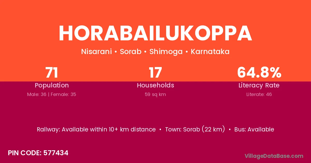 Horabailukoppa village has a total population of 71 people, of which 36 are males and 35 are females.