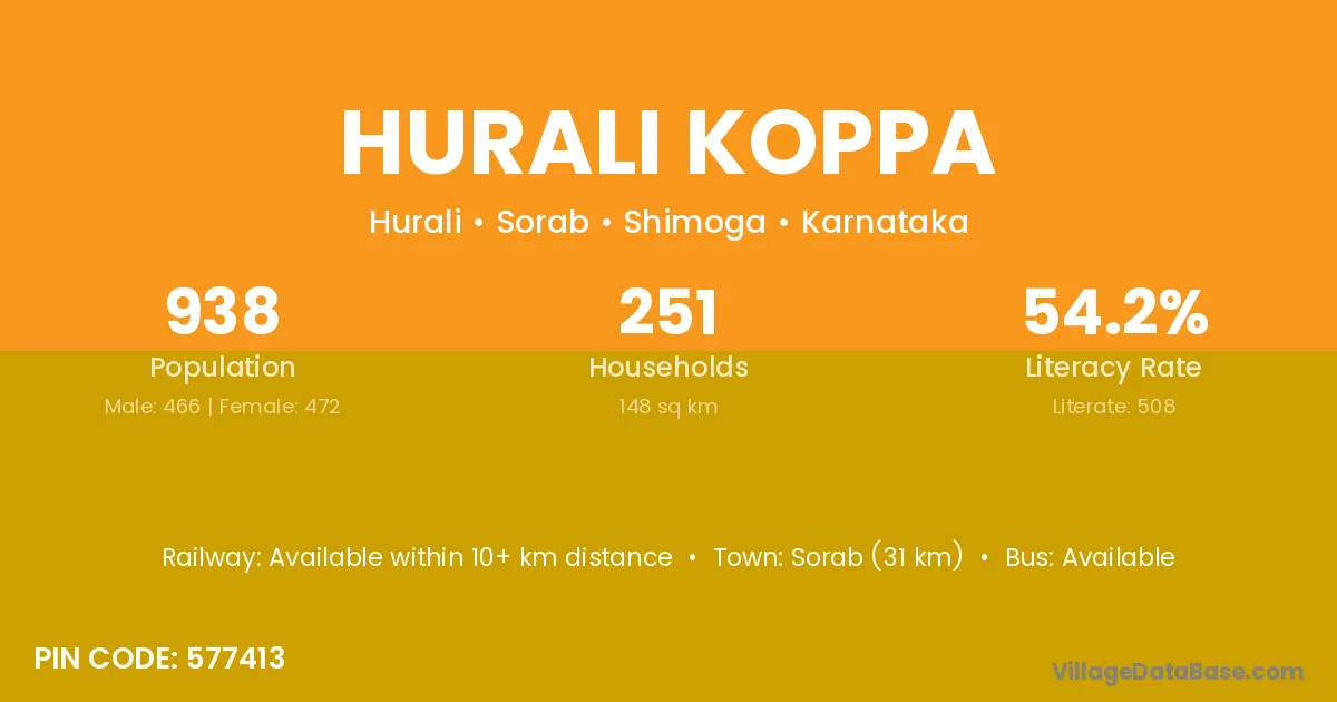 Hurali Koppa village has a total population of 938 people, of which 466 are males and 472 are females.