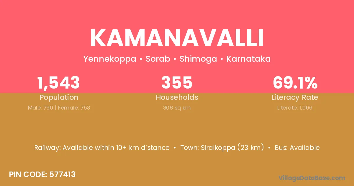 Siralkoppa (23 km) is the nearest town to Kamanavalli village for major economic activities and is located approximately 23 km away.
