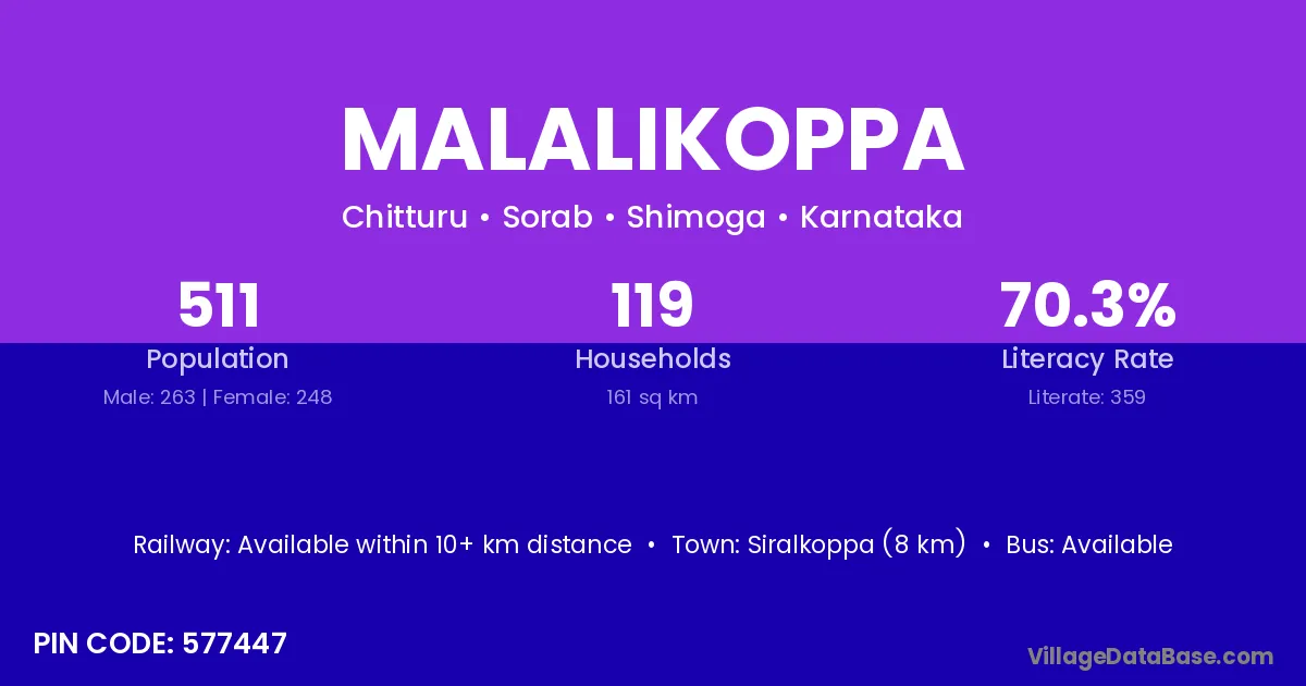 Siralkoppa (8 km) is the nearest town to Malalikoppa village for major economic activities and is located approximately 8 km away.