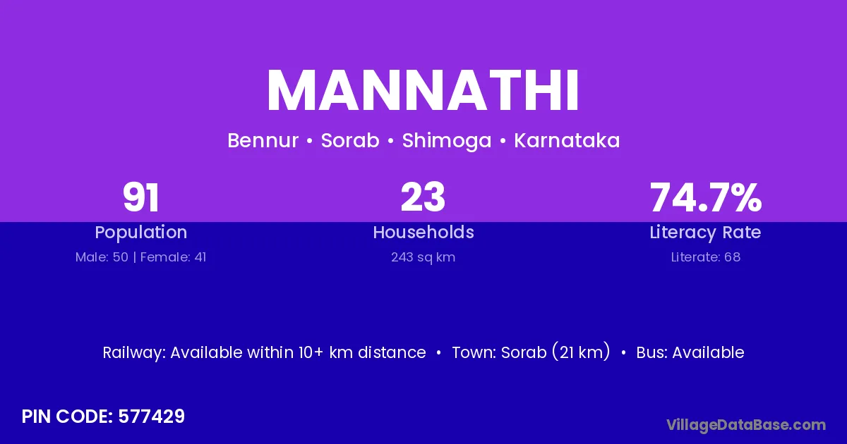 Sorab (21 km) is the nearest town to Mannathi village for major economic activities and is located approximately 21 km away.