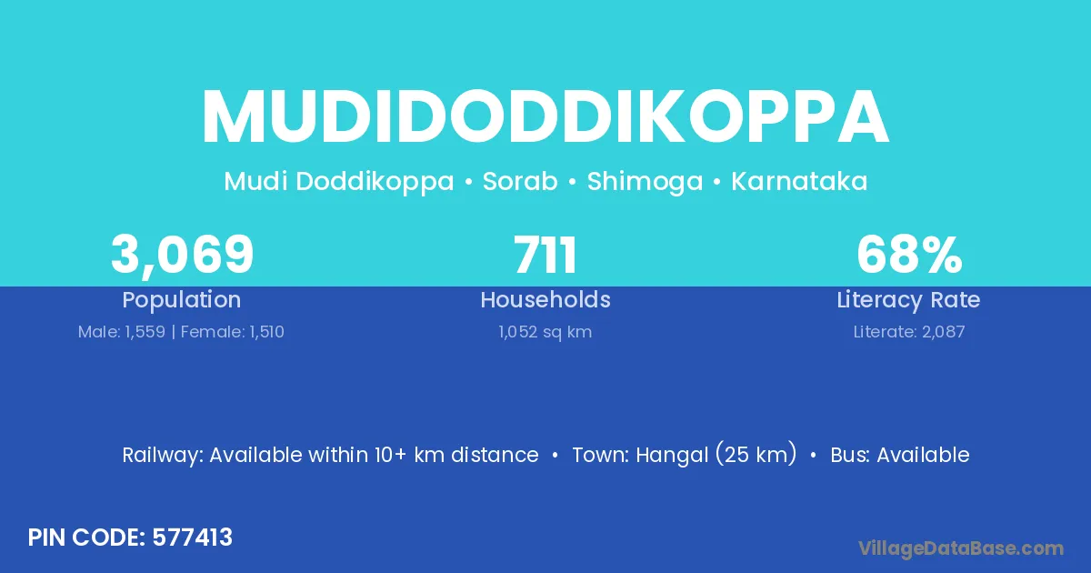 Hangal (25 km) is the nearest town to Mudidoddikoppa village for major economic activities and is located approximately 25 km away.