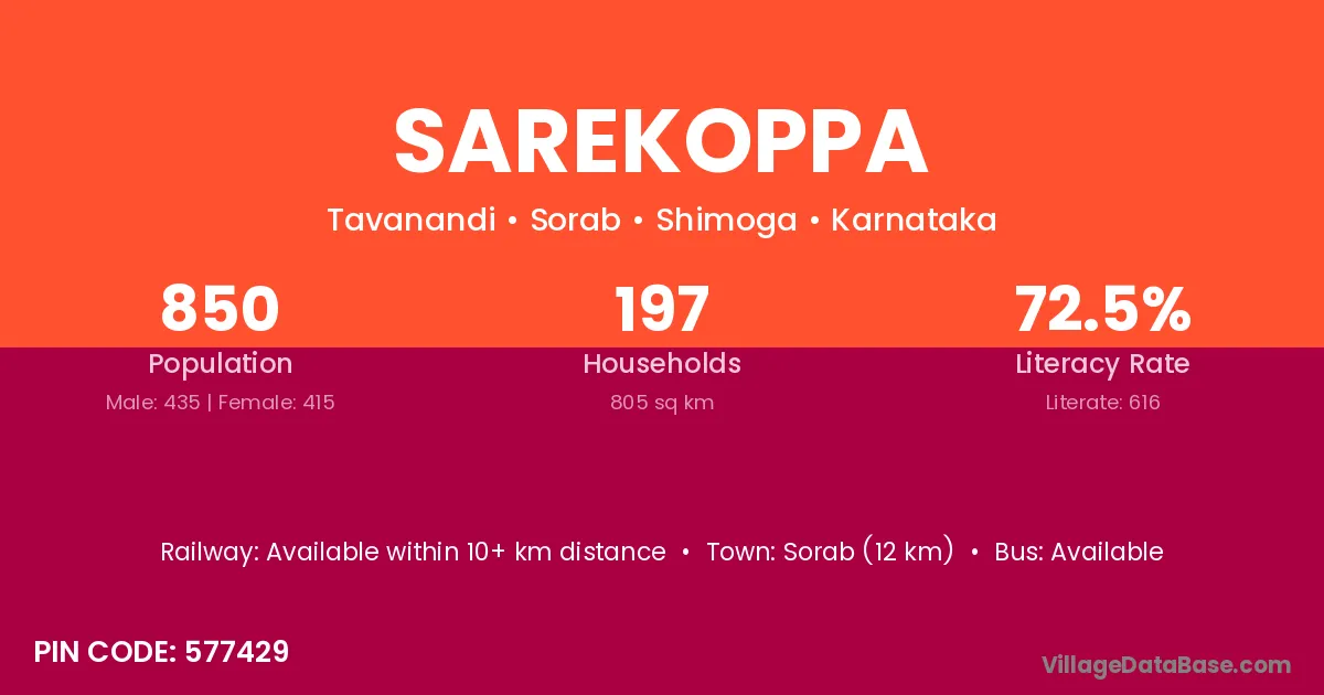 Sarekoppa village has a total population of 850 people, of which 435 are males and 415 are females.
