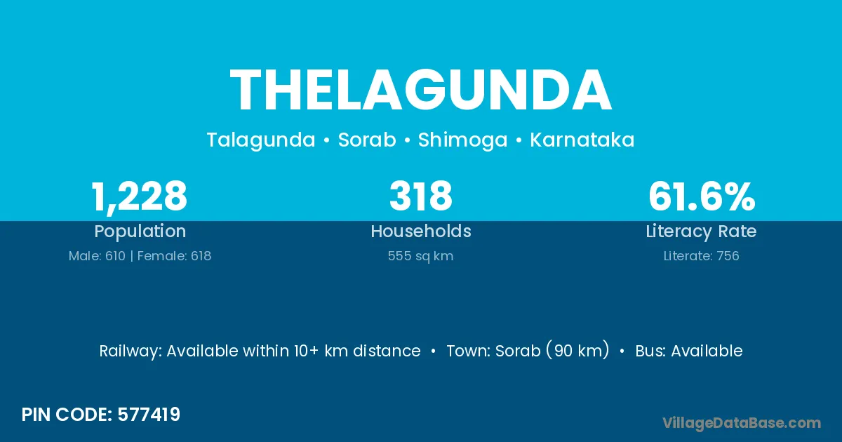 Thelagunda village has a total population of 1,228 people, of which 610 are males and 618 are females.