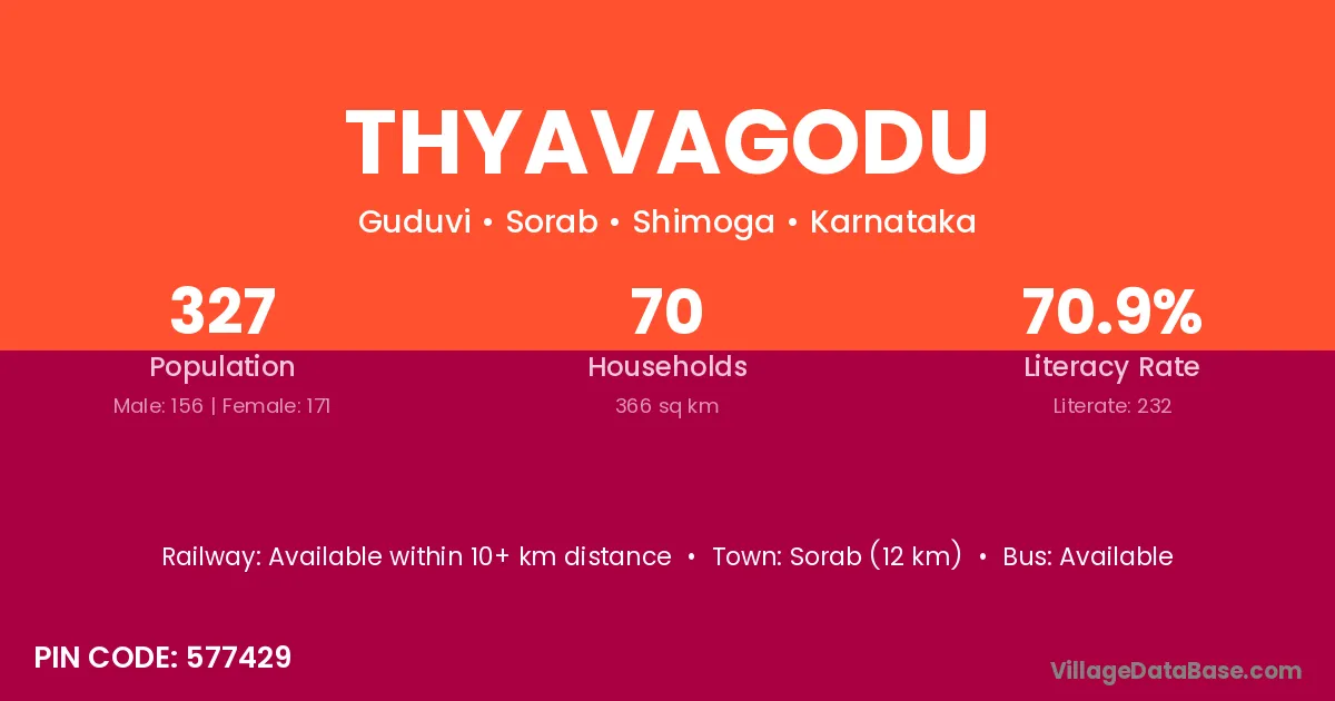 Thyavagodu village has a total population of 327 people, of which 156 are males and 171 are females.