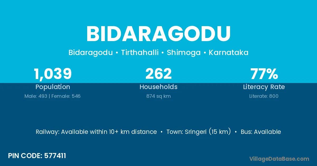 Sringeri (15 km) is the nearest town to Bidaragodu village for major economic activities and is located approximately 15 km away.
