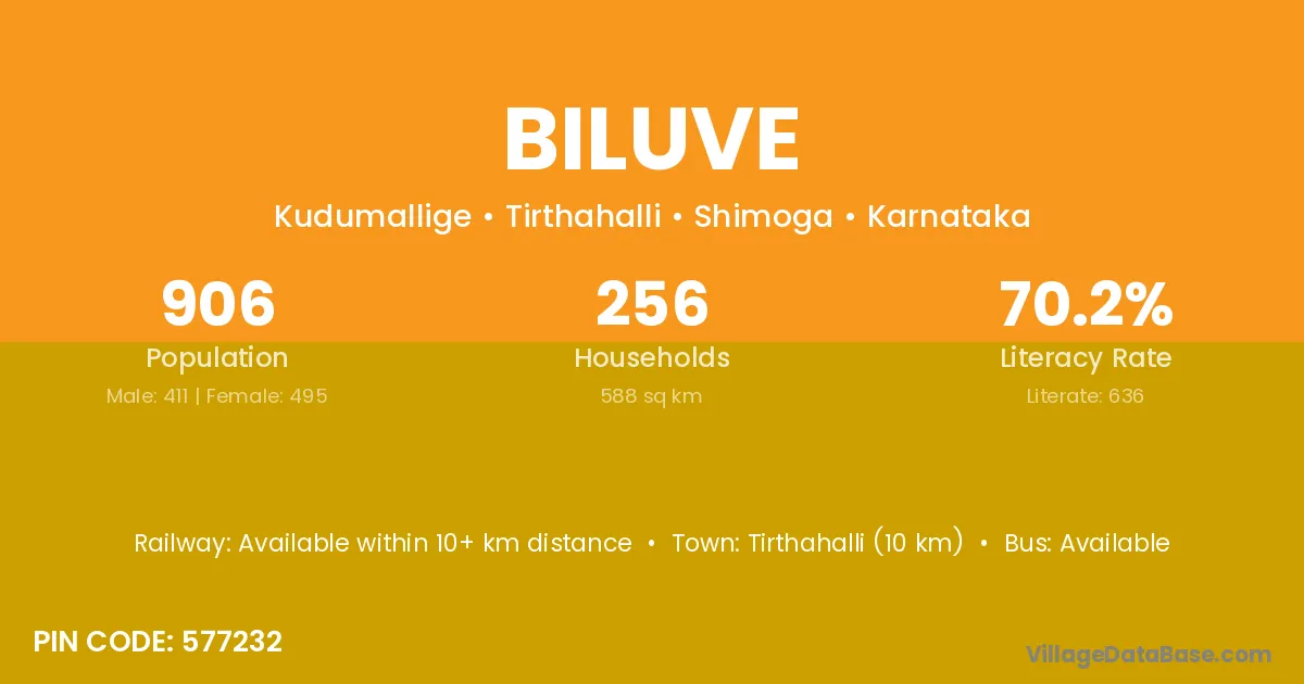 Tirthahalli (10 km) is the nearest town to Biluve village for major economic activities and is located approximately 10 km away.