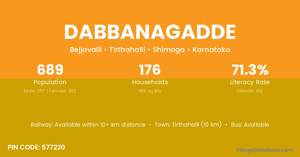 Tirthahalli (10 km) is the nearest town to Dabbanagadde village for major economic activities and is located approximately 10 km away.