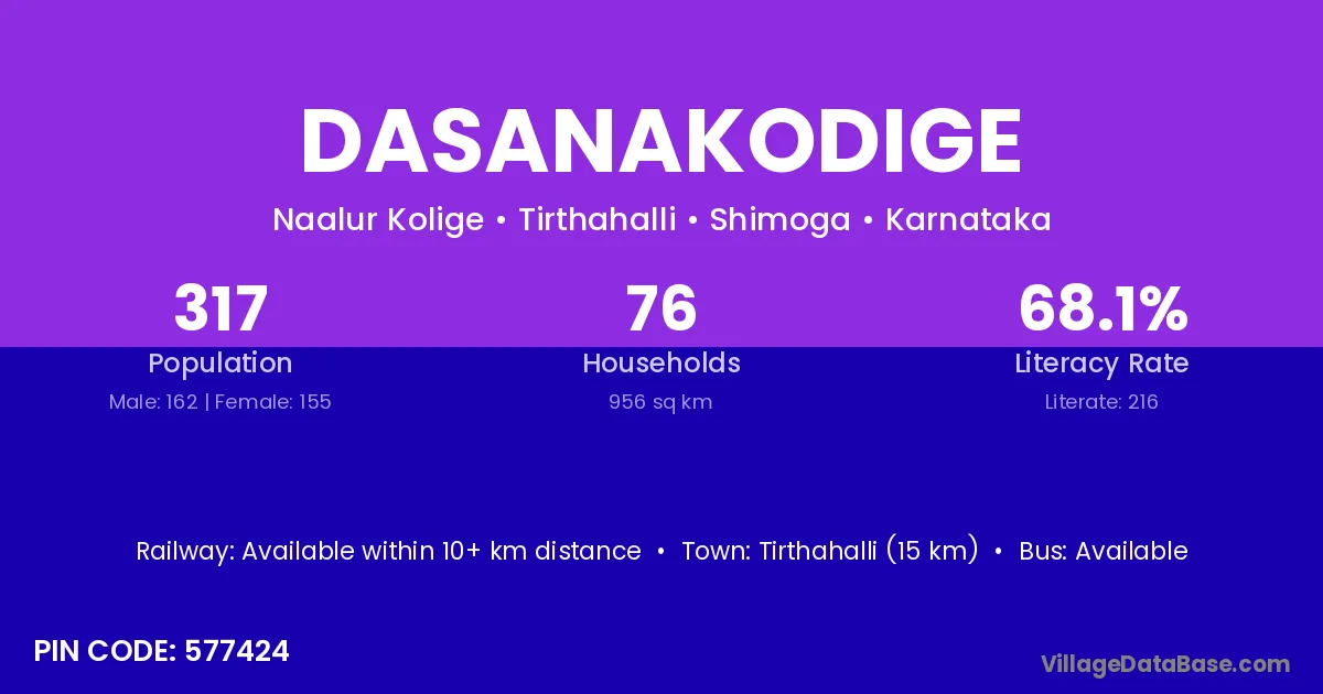 Tirthahalli (15 km) is the nearest town to Dasanakodige village for major economic activities and is located approximately 15 km away.