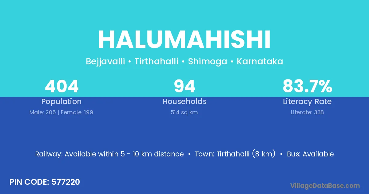 Tirthahalli (8 km) is the nearest town to Halumahishi village for major economic activities and is located approximately 8 km away.