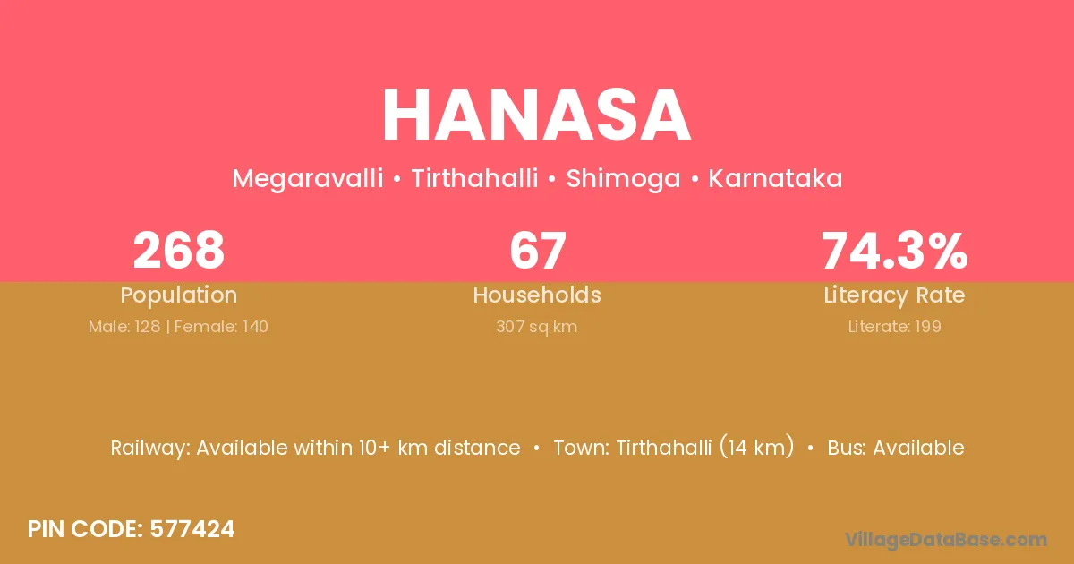 Tirthahalli (14 km) is the nearest town to Hanasa village for major economic activities and is located approximately 14 km away.