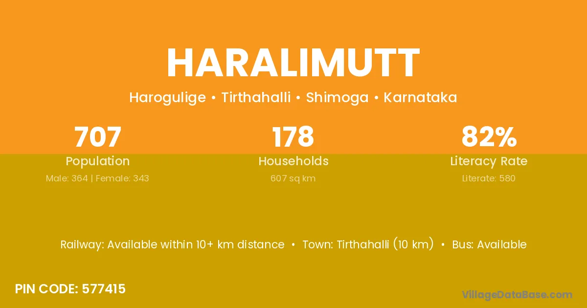 Tirthahalli (10 km) is the nearest town to Haralimutt village for major economic activities and is located approximately 10 km away.