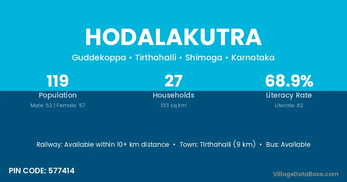 Tirthahalli (9 km) is the nearest town to Hodalakutra village for major economic activities and is located approximately 9 km away.