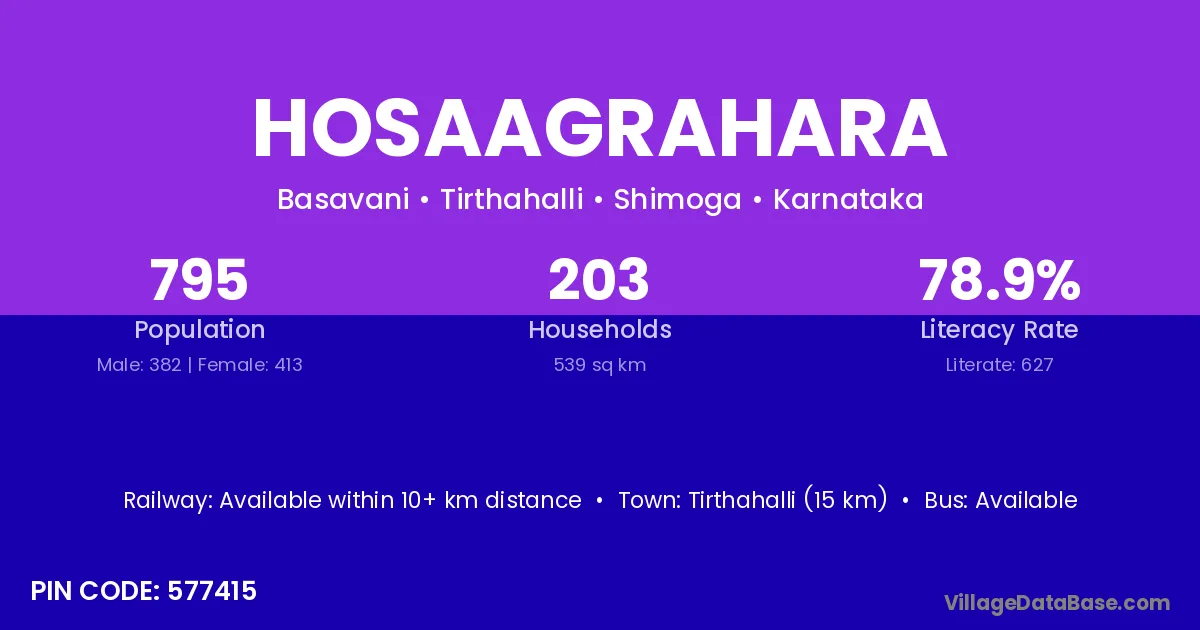 Tirthahalli (15 km) is the nearest town to Hosaagrahara village for major economic activities and is located approximately 15 km away.
