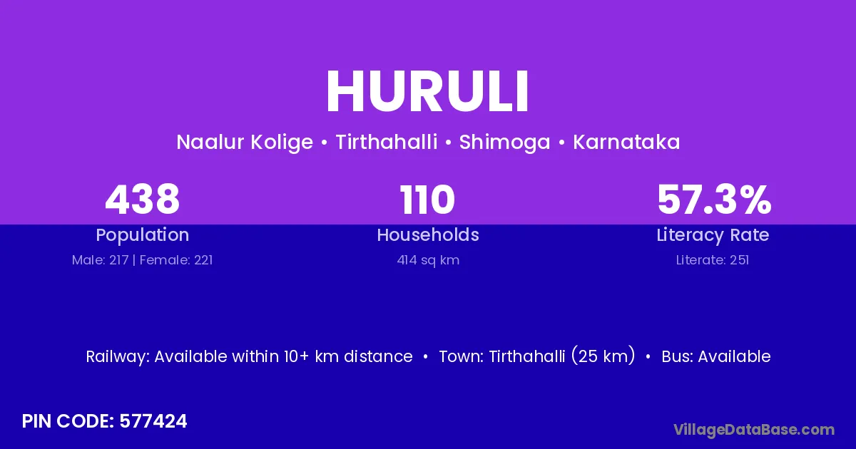 Tirthahalli (25 km) is the nearest town to Huruli village for major economic activities and is located approximately 25 km away.