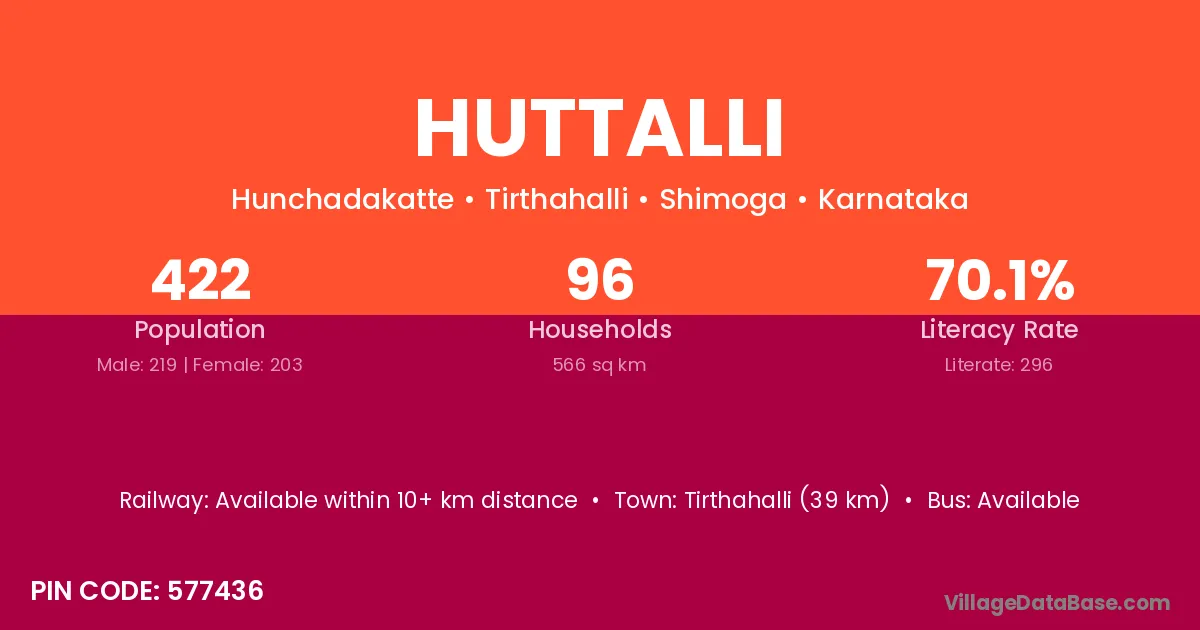 Tirthahalli (39 km) is the nearest town to Huttalli village for major economic activities and is located approximately 39 km away.
