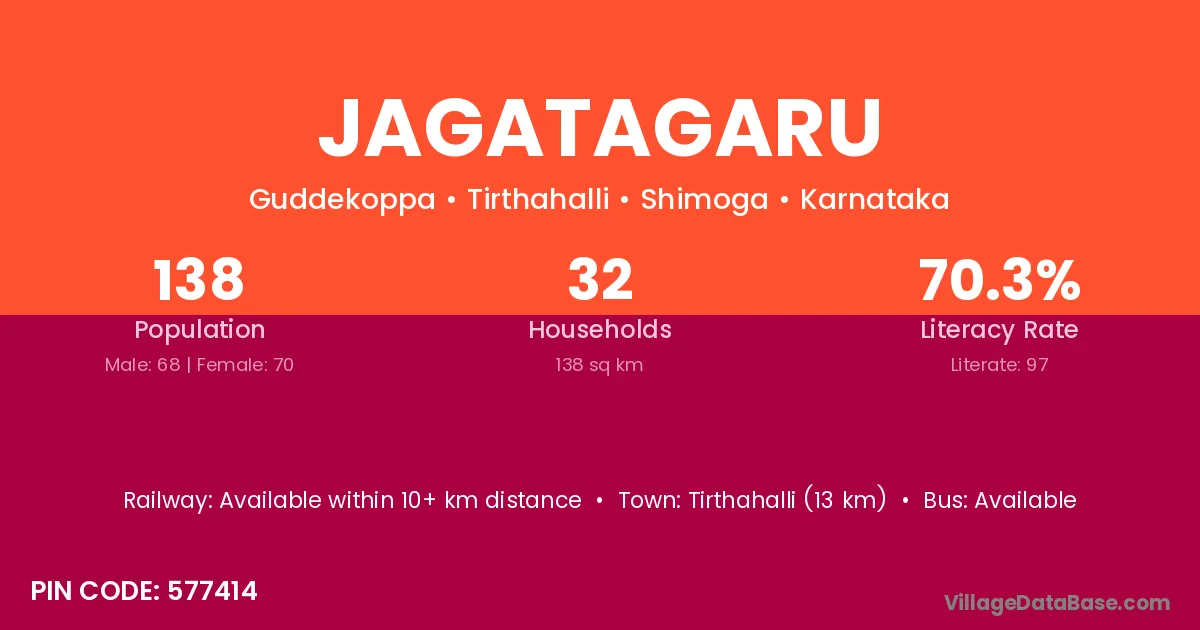 Tirthahalli (13 km) is the nearest town to Jagatagaru village for major economic activities and is located approximately 13 km away.