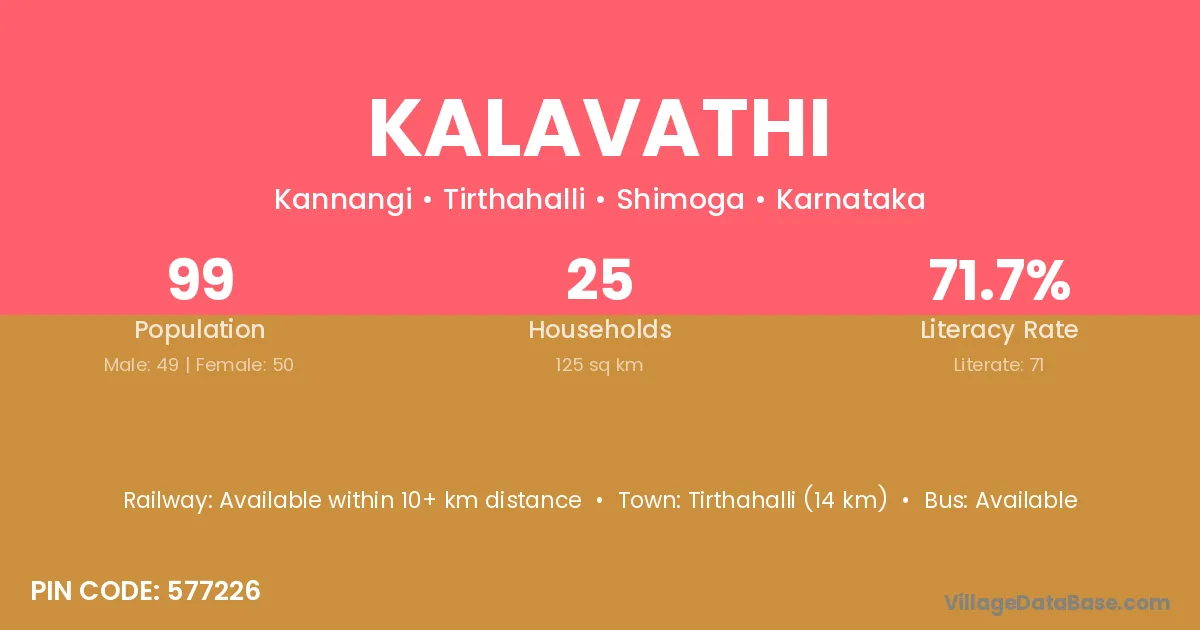Tirthahalli (14 km) is the nearest town to Kalavathi village for major economic activities and is located approximately 14 km away.
