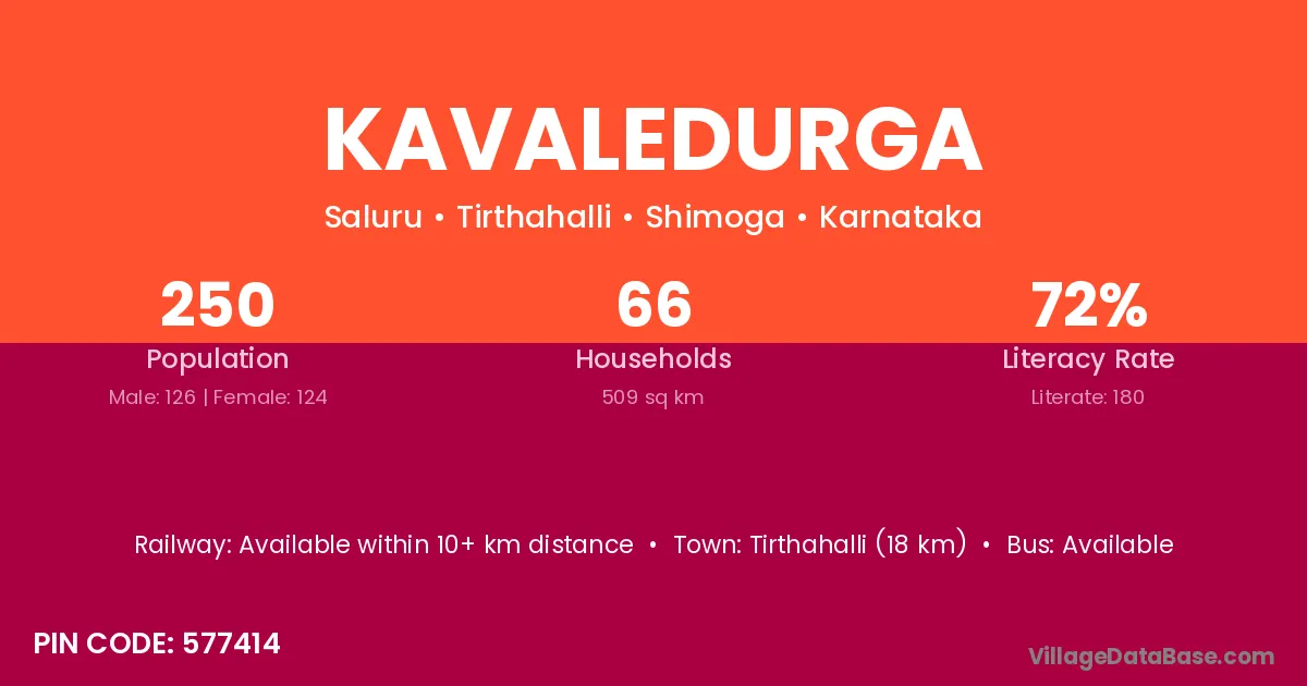 Tirthahalli (18 km) is the nearest town to Kavaledurga village for major economic activities and is located approximately 18 km away.