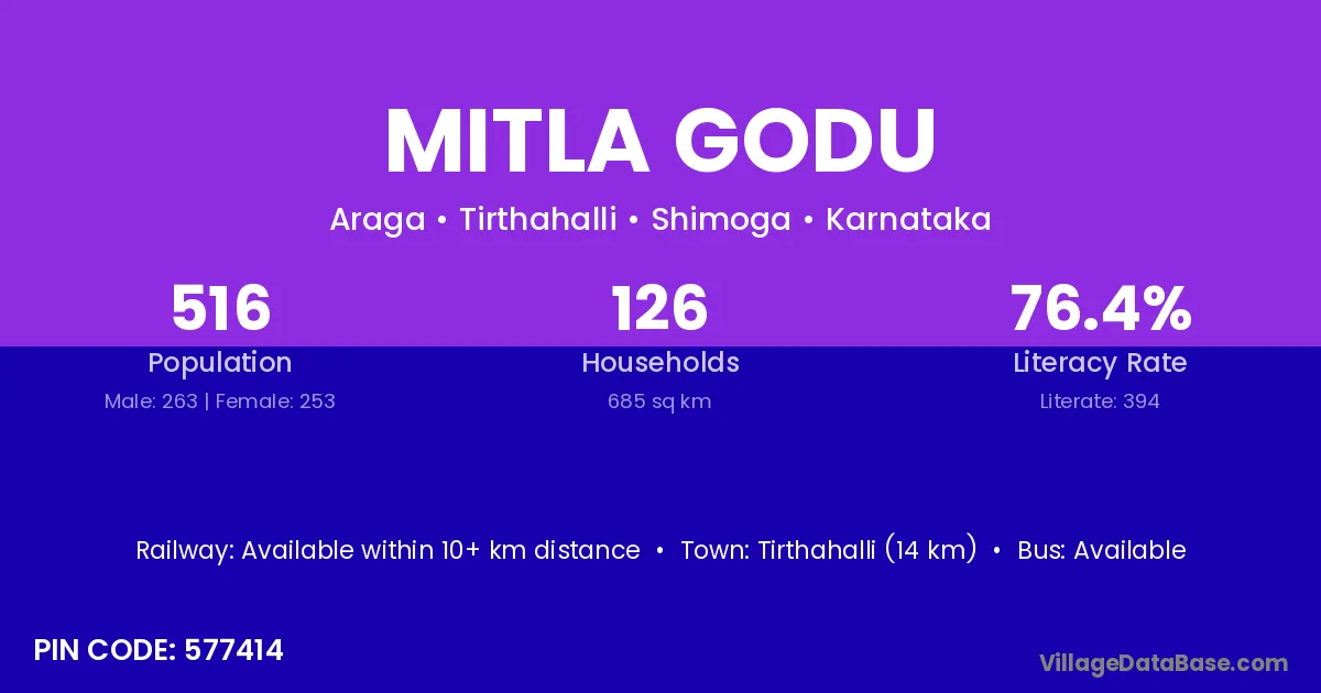 Tirthahalli (14 km) is the nearest town to Mitla Godu village for major economic activities and is located approximately 14 km away.