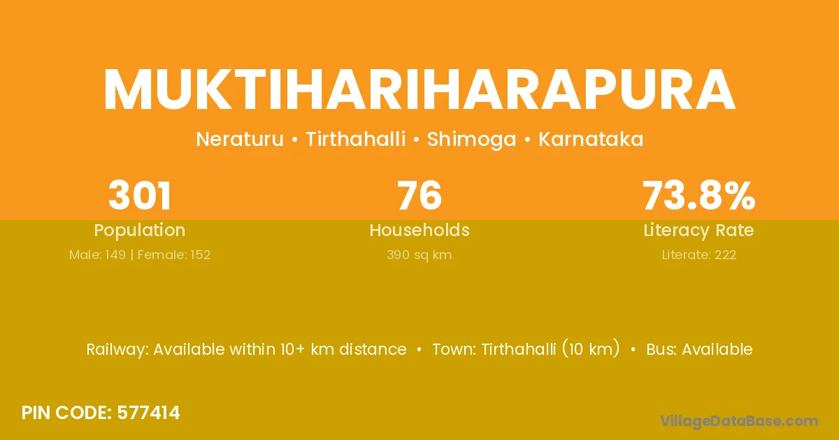 Tirthahalli (10 km) is the nearest town to Muktihariharapura village for major economic activities and is located approximately 10 km away.