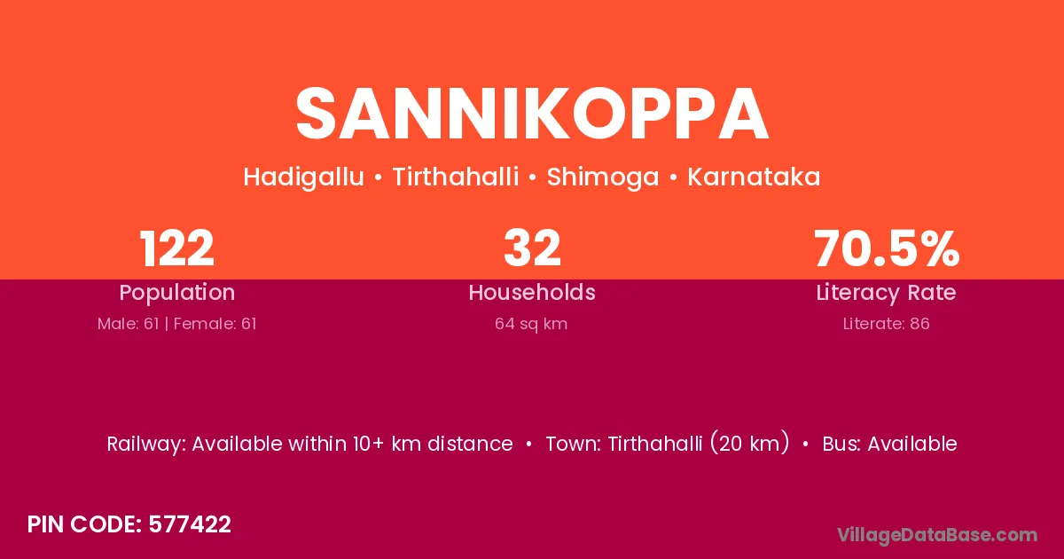 Tirthahalli (20 km) is the nearest town to Sannikoppa village for major economic activities and is located approximately 20 km away.
