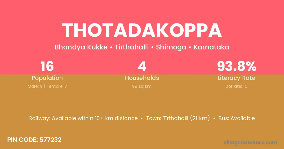 Tirthahalli (21 km) is the nearest town to Thotadakoppa village for major economic activities and is located approximately 21 km away.