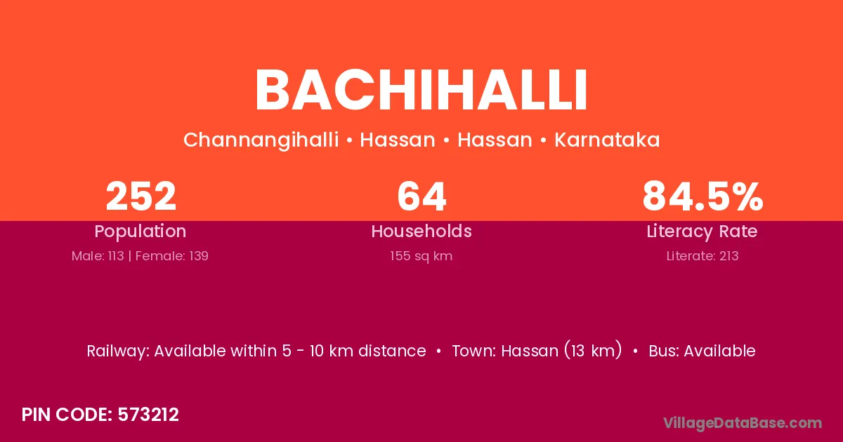 Bachihalli village has a total population of 464 people, of which 234 are males and 230 are females.