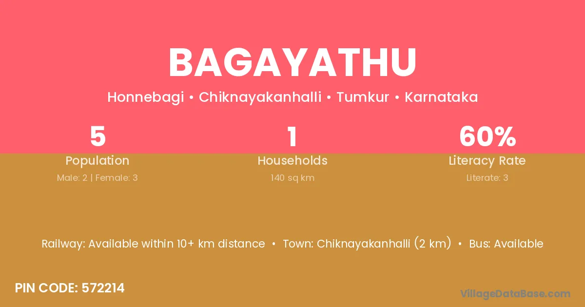 Chiknayakanhalli (2 km) is the nearest town to Bagayathu village for major economic activities and is located approximately 2 km away.