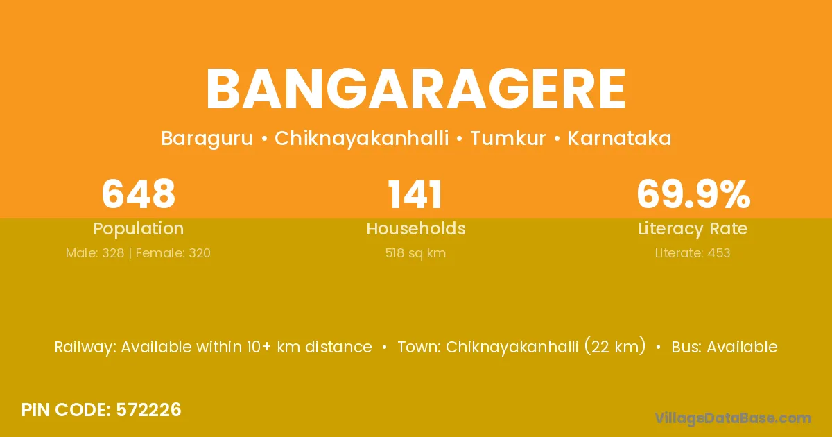 Chiknayakanhalli (22 km) is the nearest town to Bangaragere village for major economic activities and is located approximately 22 km away.