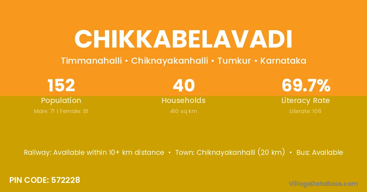 Chiknayakanhalli (20 km) is the nearest town to Chikkabelavadi village for major economic activities and is located approximately 20 km away.
