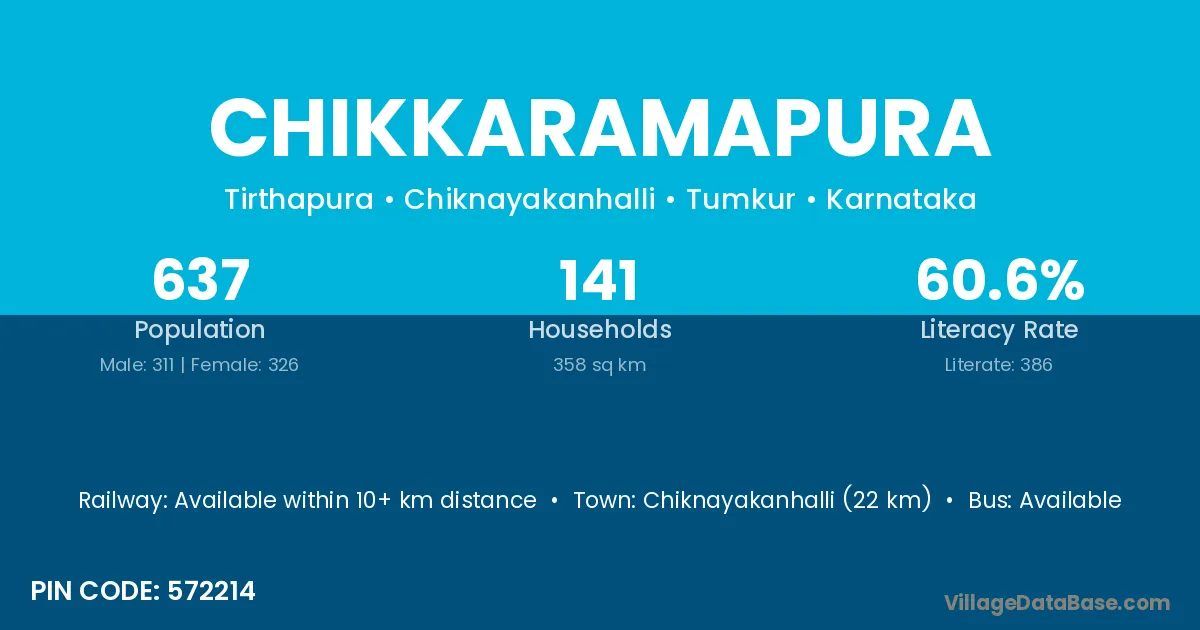 Chiknayakanhalli (22 km) is the nearest town to Chikkaramapura village for major economic activities and is located approximately 22 km away.