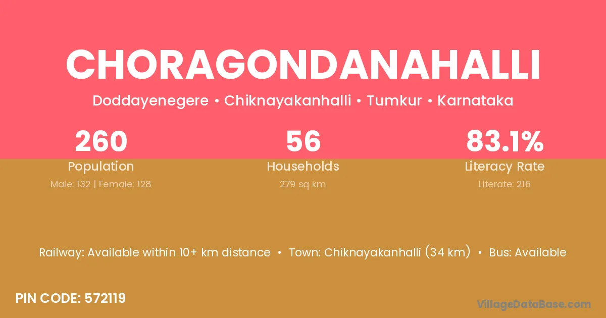 Chiknayakanhalli (34 km) is the nearest town to Choragondanahalli village for major economic activities and is located approximately 34 km away.