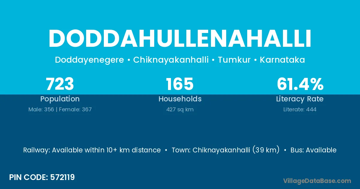 Chiknayakanhalli (39 km) is the nearest town to Doddahullenahalli village for major economic activities and is located approximately 39 km away.