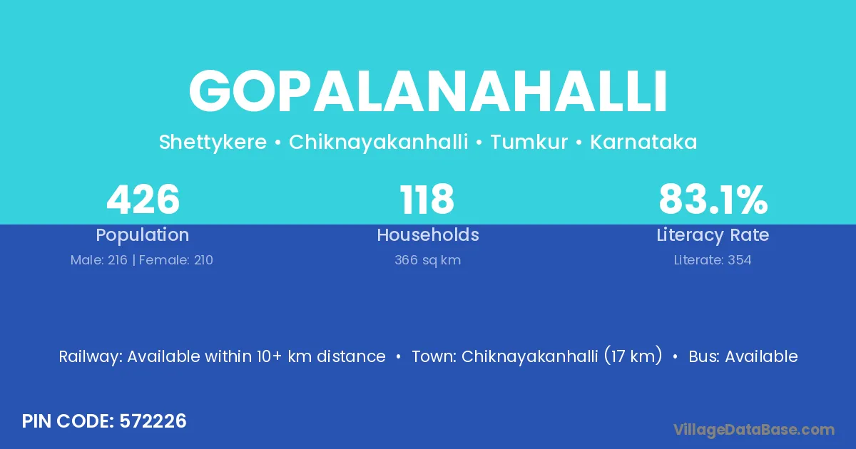 Chiknayakanhalli (17 km) is the nearest town to Gopalanahalli village for major economic activities and is located approximately 17 km away.