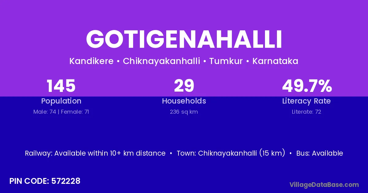 Gotigenahalli village has a total population of 145 people, of which 74 are males and 71 are females.
