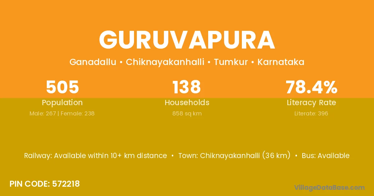 Chiknayakanhalli (36 km) is the nearest town to Guruvapura village for major economic activities and is located approximately 36 km away.
