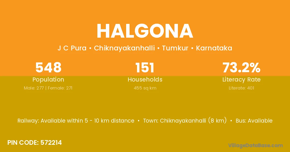 Chiknayakanhalli (8 km) is the nearest town to Halgona village for major economic activities and is located approximately 8 km away.