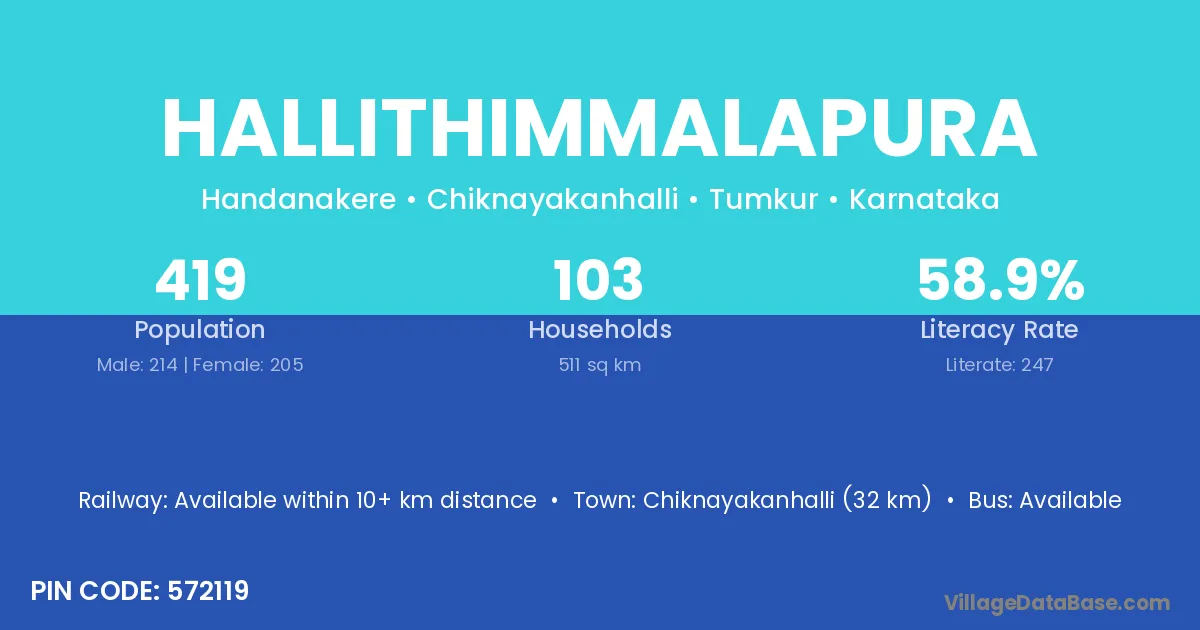 Hallithimmalapura village has a total population of 419 people, of which 214 are males and 205 are females.