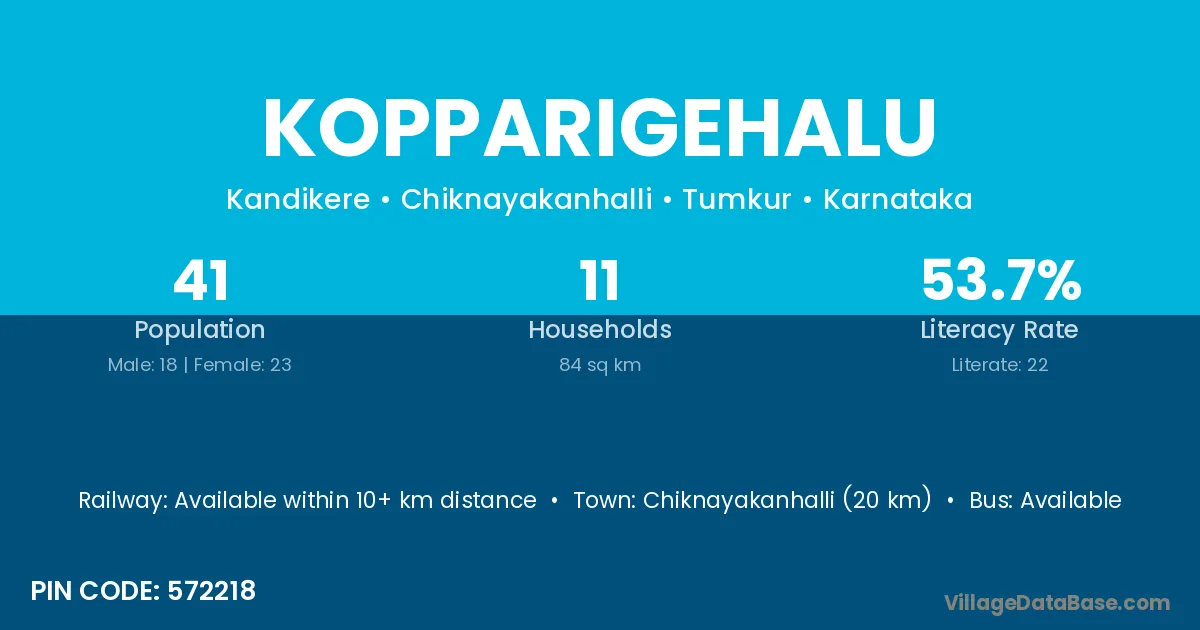 Chiknayakanhalli (20 km) is the nearest town to Kopparigehalu village for major economic activities and is located approximately 20 km away.