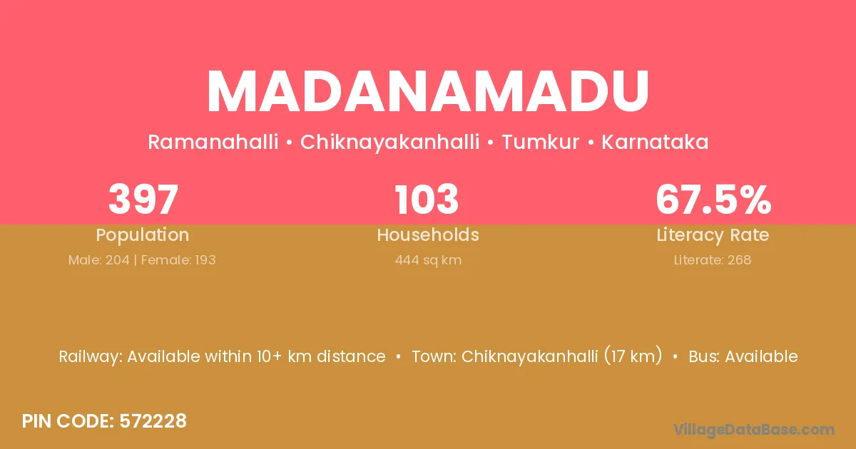 Chiknayakanhalli (17 km) is the nearest town to Madanamadu village for major economic activities and is located approximately 17 km away.